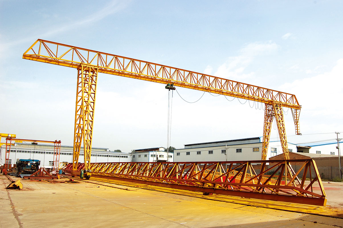 它的金屬結(jié)構(gòu)像門形框架,承載主梁下安裝兩條支腳,可以直接在地面的軌道上行走,主梁兩端可以具有外伸懸臂梁。