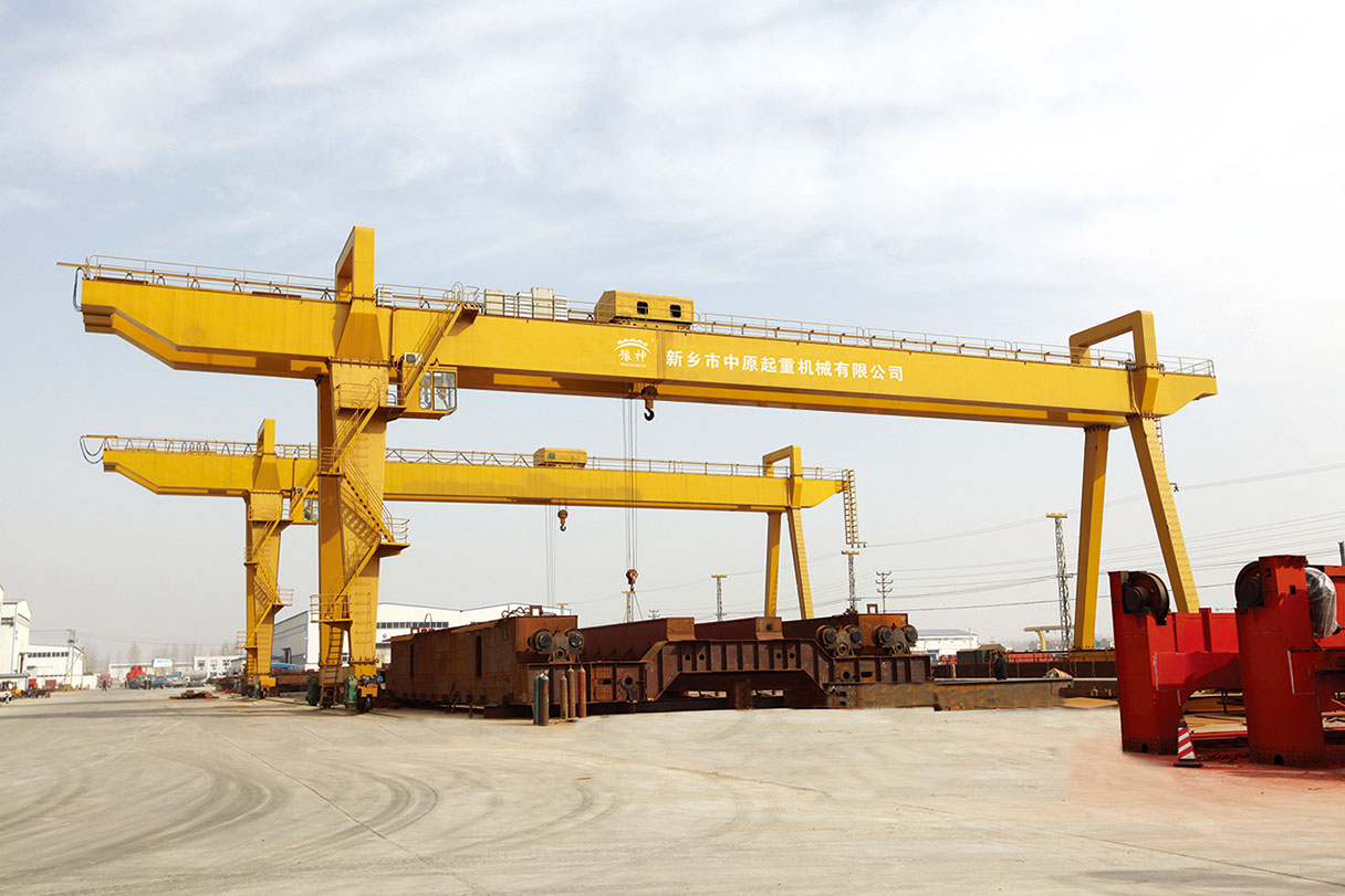它的金屬結(jié)構(gòu)像門形框架,承載主梁下安裝兩條支腳,可以直接在地面的軌道上行走,主梁兩端可以具有外伸懸臂梁。